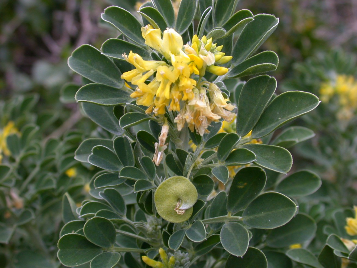 Medicago citrina is a small tree or round-shaped shrub reaching 2 m in height, with an erect single or multi-stemmed trunk. It has alternate, compound leaves composed of three leaflets. Flowers are lemon yellow in color, initially forming dense bunches which become sparser as the fruits start to mature. The plant flowers during late winter and early spring and the fruits form spiral-shaped pods. Some differences in morphological characters have been found amongst the 3 main population groups (Columbretes, Balearic Islands, and Northeastern Alicante).